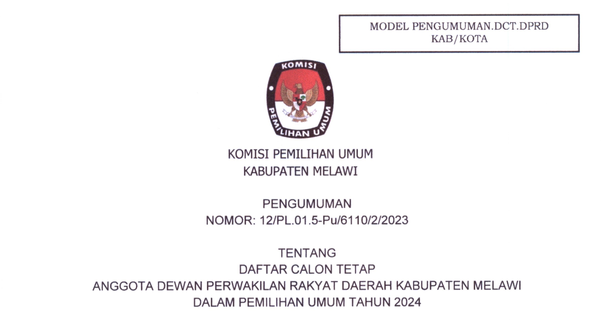 PENGUMUMAN TENTANG DAFTAR CALON TETAP ANGGOTA DEWAN PERWAKILAN RAKYAT DAERAH KABUPATEN MELAWI DALAM PEMILIHAN UMUM TAHUN 2024
