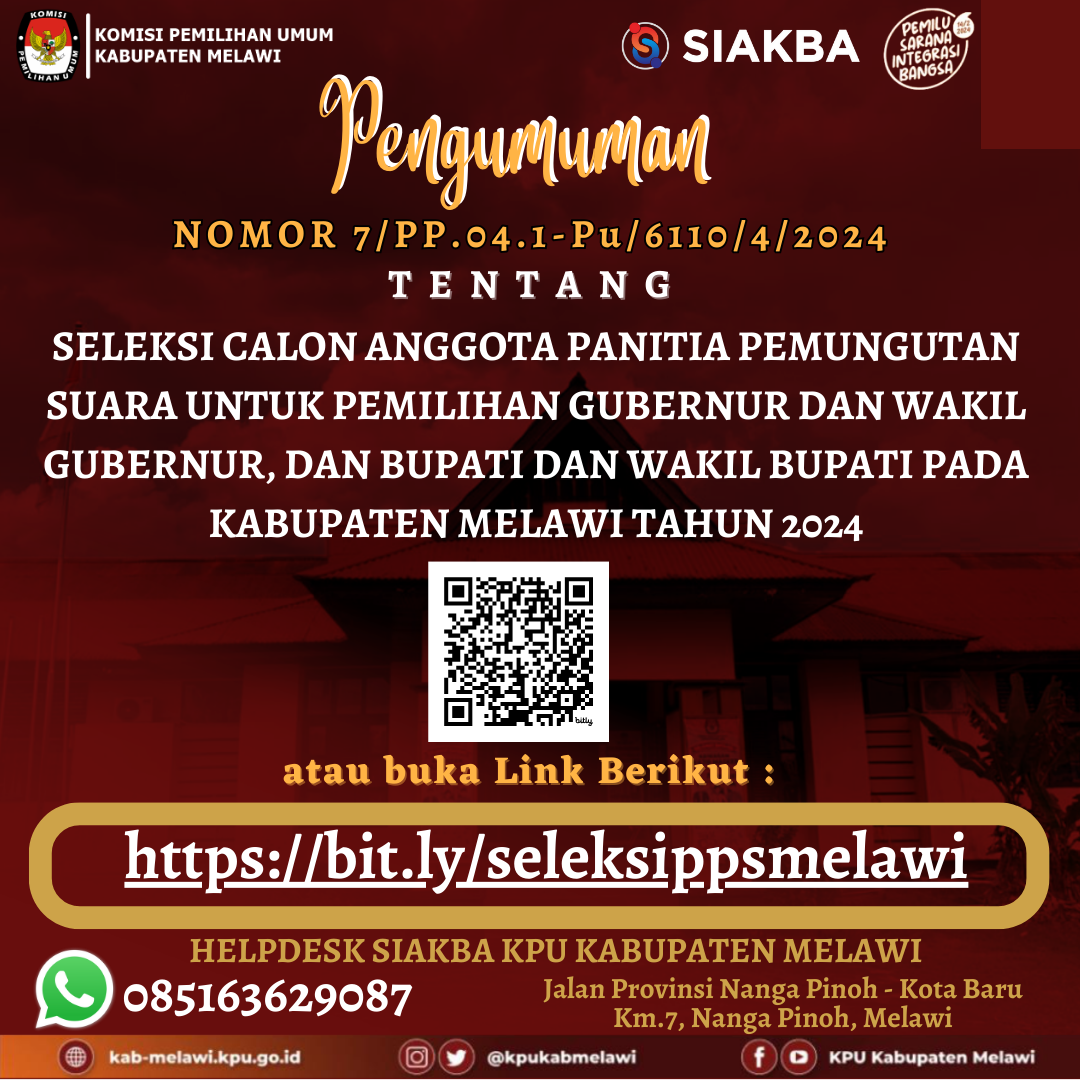 Dalam rangka pembentukan Calon Anggota Panitia Pemungutan Suara untuk Pemilihan Gubernur dan Wakil Gubernur, dan Bupati dan Wakil Bupati Tahun 2024, Komisi Pemilihan Umum Kabupaten Melawi mengundang Warga Negara Indonesia yang memenuhi kualifikasi untuk mendaftarkan diri menjadi Panitia Pemungutan Suara untuk Pemilihan Gubernur dan Wakil Gubernur, dan Bupati dan Wakil Bupati Tahun 2024 SELANJUTNYA KLIK BERIKUT : PENGUMUMAN LENGKAP, FORM PENDAFTARAN, SURAT PERNYATAAN, DAN DAFTAR RIWAYAT HIDUP ....