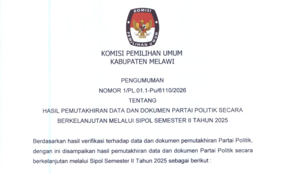 PENGUMUMAN HASIL PEMUTAKHIRAN DATA DAN DOKUMEN PARTAI POLITIK SECARA BERKELANJUTAN MELALUI SIPOL SEMESTER II TAHUN 2025