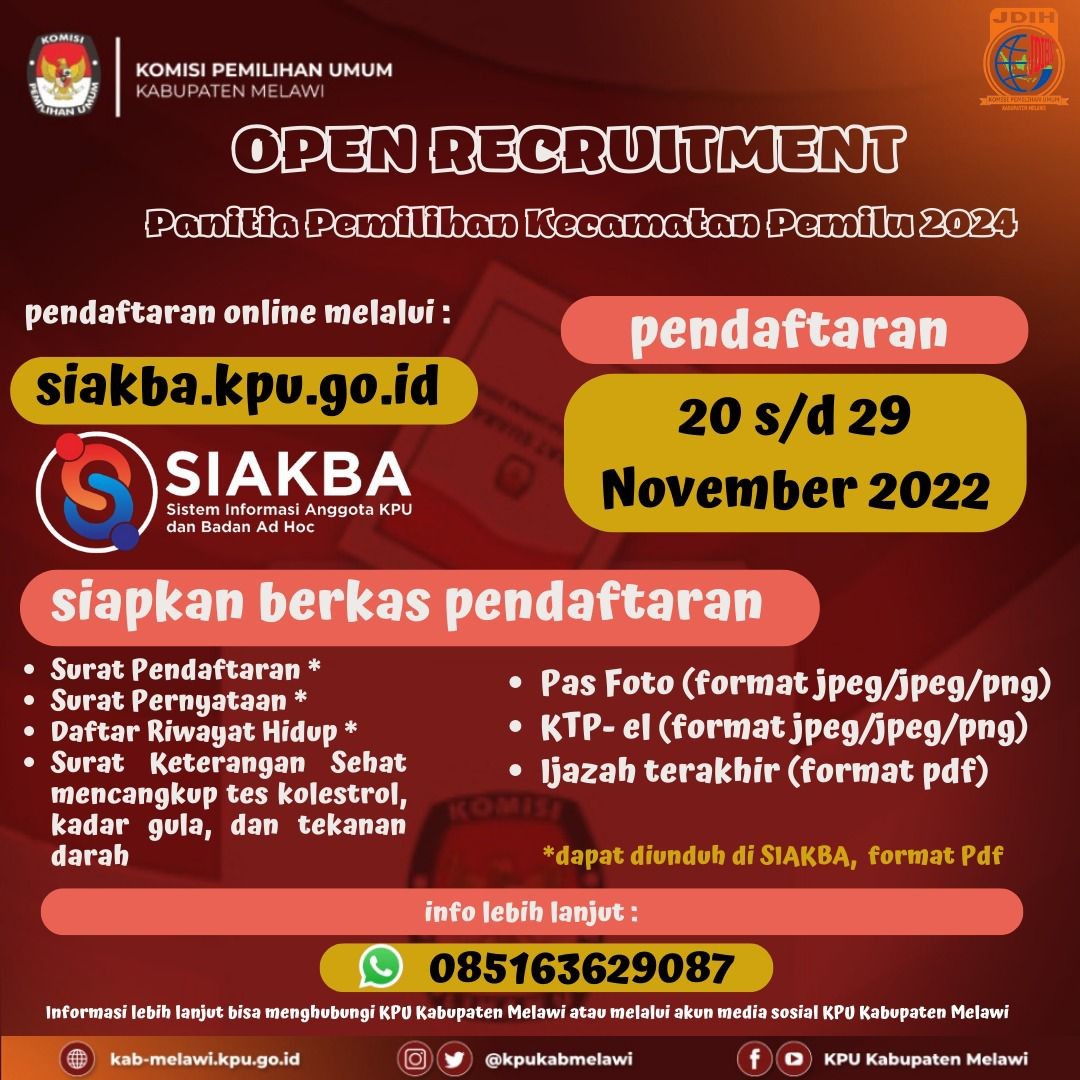 Penerimaan Pendaftaran pada tanggal 20 s.d 29 November 2022 melalui web siakba.kpu.go.id