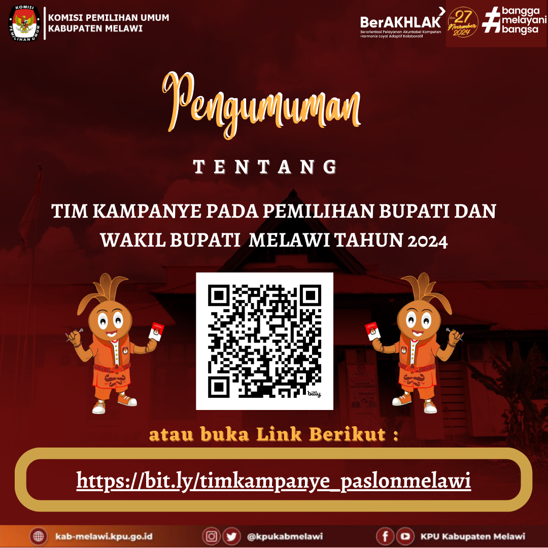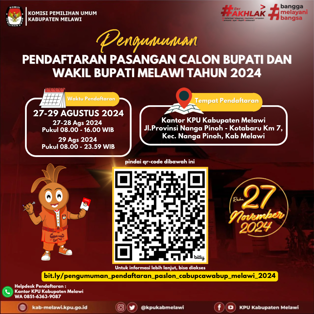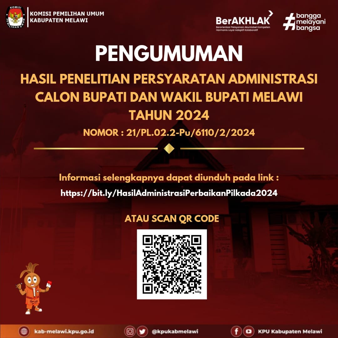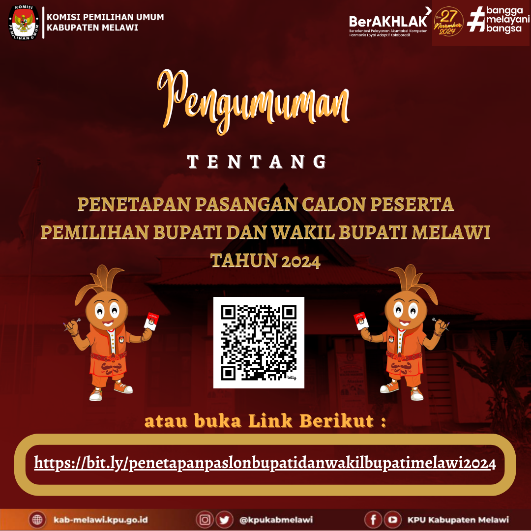 PENGUMUMAN NOMOR : 24/PL.02.3-Pu/6110/2/2024 TENTANG PENETAPAN PASANGAN CALON PESERTA PEMILIHAN BUPATI DAN WAKIL BUPATI MELAWI TAHUN 2024 Berdasarkan ketentuan Pasal 120 ayat (3) Peraturan Komisi Pemilihan Umum Nomor 8 Tahun 2024 tentang Pencalonan Gubernur dan Wakil Gubernur, Bupati dan Wakil Bupati, serta Walikota dan Wakil Walikota sebagaimana telah diubah dengan Peraturan Komisi Pemilihan Umum Nomor 10 Tahun 2024 tentang Perubahan atas Peraturan Komisi Pemilihan Umum Nomor 8 Tahun 2024 tentang Pencalonan Gubernur dan Wakil Gubernur, Bupati dan Wakil Bupati, serta Walikota dan Wakil Walikota dan Keputusan Komisi Pemilihan Umum Kabupaten Melawi Nomor 768 Tahun 2024 Tentang Penetapan Pasangan Calon Peserta Pemilihan Bupati Dan Wakil Bupati Melawi Tahun 2024, dengan ini Komisi Pemilihan Umum Kabupaten Melawi mengumumkan Penetapan Pasangan Calon Peserta Pemilihan Bupati dan Wakil Bupati Melawi Tahun 2024 sebagai berikut: PENGUMUMAN LENGKAP KLIK DISINI KEPUTUSAN KPU KABUPATEN MELAWI TENTANG PENETAPAN PASANGAN CALON PESERTA PEMILIHAN BUPATI DAN WAKIL BUPATI MELAWI TAHUN 2024 KLIK DISINI