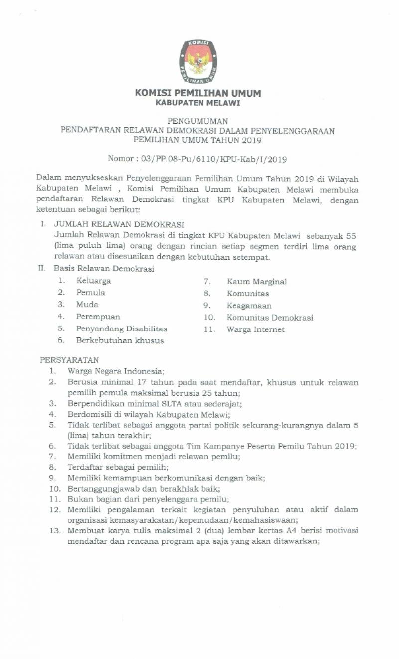 Memperhatikan dasar di atas, maka Komisi Pemilihan Umum Kabupaten Melawi mengajak masyarakat Kabupaten Melawi yang memenuhi syarat untuk menjadi calon anggota Panitia Pemilihan Kecamatan (PPK) dan Panitia Pemungutan Suara (PPS) dalam Penyelenggaraan Pemilihan Gubernur dan Wakil Gubernur Kalimantan Barat Tahun 2018 dengan persyaratan sebagai berikut: