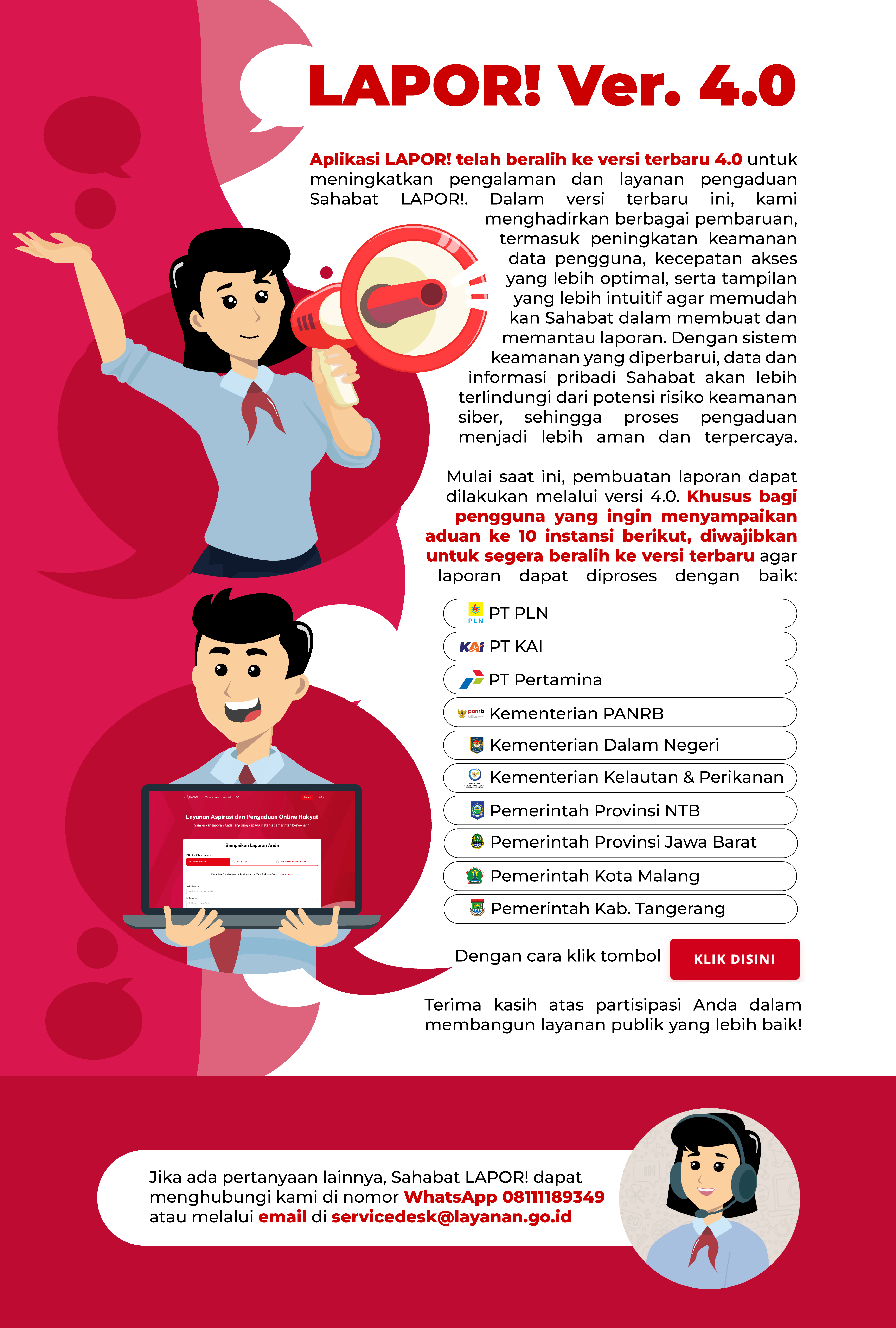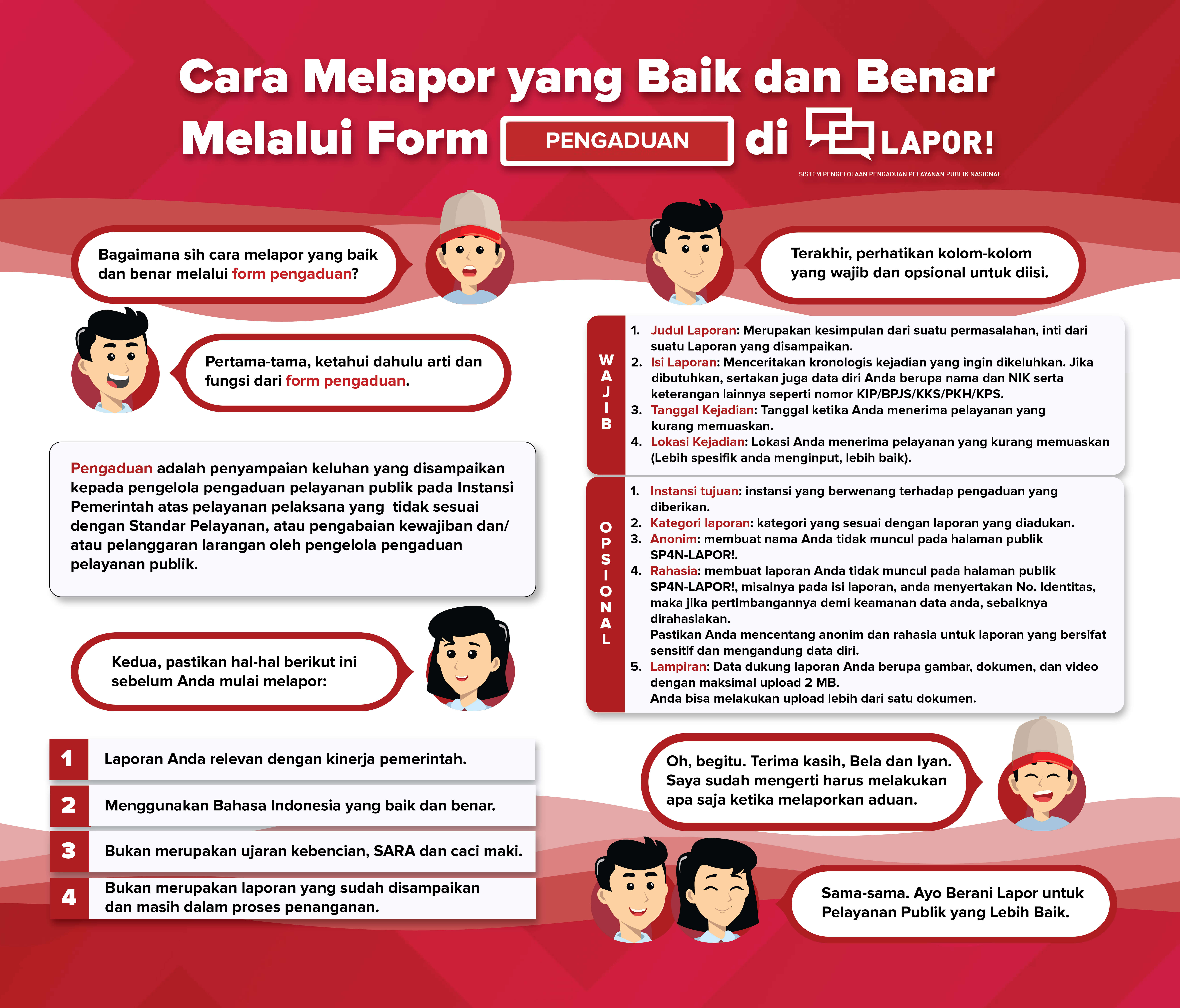 Sistem Pengelolaan Pengaduan Pelayanan Publik Nasional (SP4N) - Layanan Aspirasi dan Pengaduan Online Rakyat (LAPOR!) adalah pengelolaan layanan penyampaian semua aspirasi dan pengaduan pelayanan publik secara berjenjang pada setiap penyelenggara dalam kerangka sistem informasi pelayanan publik masyarakat yang terintegrasi secara Nasional dengan laman akses website SP4N-LAPOR! Ini berbasis teknologi, mudah dipantau, dapat berinteraksi antar lembaga di berbagai jenjang.